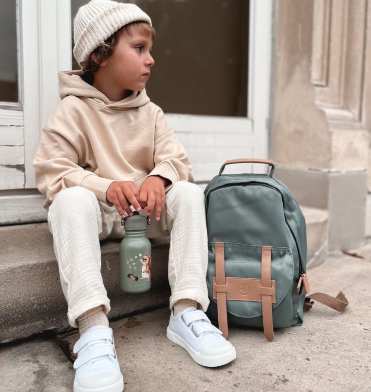 Ruksak ima termo jastučić za sjedenje koji grije tijekom odmora, termo-džep za bočicu koji održava temperaturu napitka, te podesive, podstavljene naramenice s pametnom magnetskom kopčom koja sprječava klizanje s ramena. Zahvaljujući patentnom zatvaraču koji se otvara od vrha do dna, vaš mališan brzo pronalazi sve što traži – pogotovo kekse! Detalji od veganske kože daju mu dodatnu notu stila i kvalitete. Unutar ruksaka nalazi se i oznaka za upis imena i broja telefona, kako bi uvijek znao put nazad kući.
