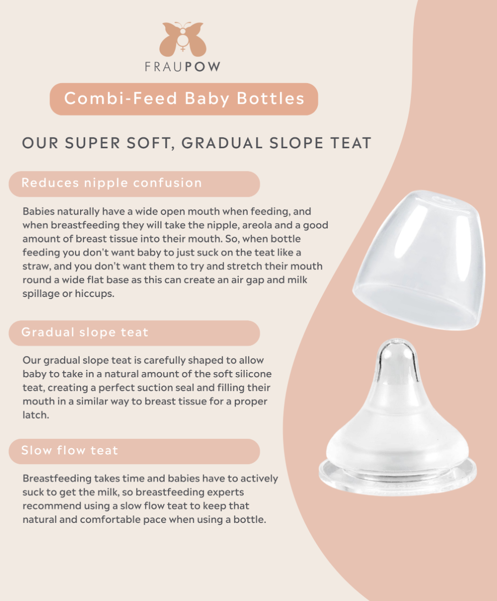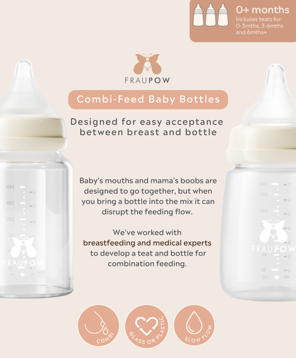 by FraupowFraupow Combi-Feed bočice za bebe osmišljene su za kombinirano hranjenje (dojenje + bočica) bez stresa i zbunjivanja bebe. Razvijene u suradnji sa stručnjacima za dojenje i medicinskim profesionalcima, ove bočice omogućuju prirodan prijelaz između dojke i bočice.