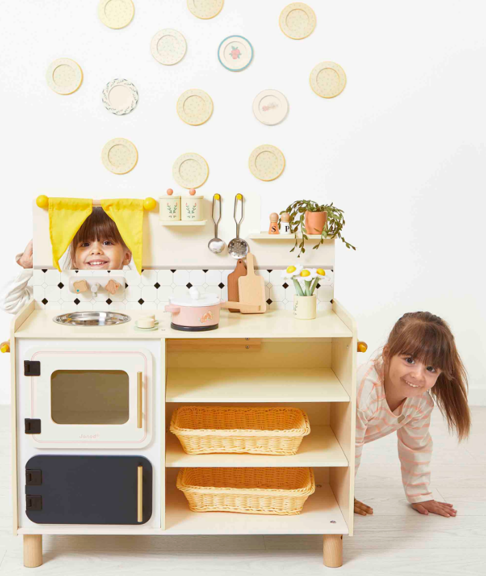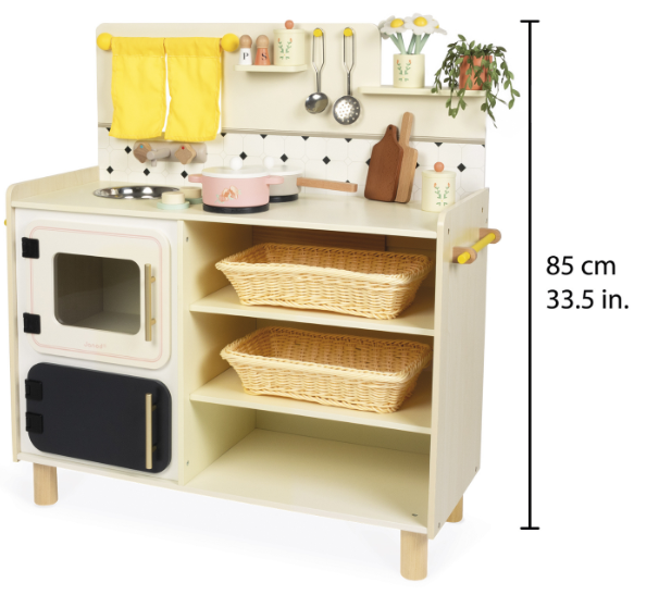 Dimenzije kuhinje omogućuju veliku površinu za igru, a dizajn inspiriran kuhinjama naših baka donosi nostalgičan šarm. Kuhinja uključuje 2 pećnice s magnetskim vratima, rotirajuće dugmadi za umivaonik, i čak ima prozor za dodatan vizualni doživljaj dok "perete" povrće!