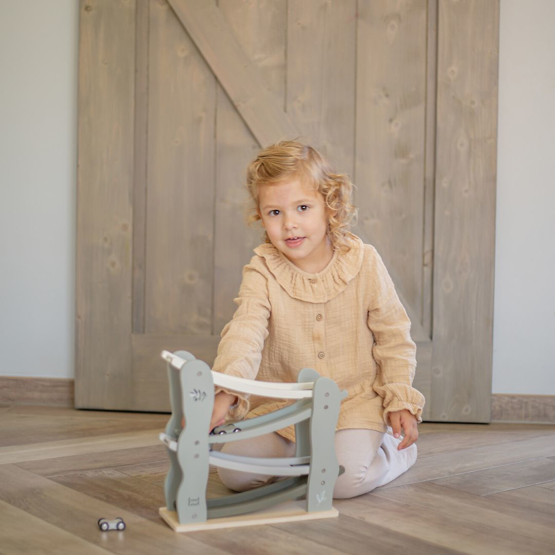 1, 2, 3… KRENI! Tko je najbrži i tko može najdalje?! Djeca će se kroz igru neizmjerno zabaviti, a ujedno će razvijati svoje motoričke sposobnosti. Trkaća staza i automobili izrađeni su od visokokvalitetnog drva s FSC certifikatom, a crni i bijeli detalji naneseni su sigurnom bojom na bazi vode. Postavite automobile na vrh i gledajte ih kako jure prema dolje i prevrću se! Potpuna zabava je zajamčena, dok se tijekom igre potiču motoričke sposobnosti, koordinacija oko-ruka i logično zaključivanje.