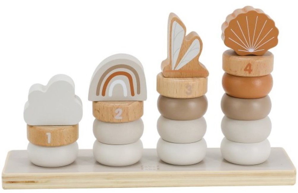 Drvena didaktička igračka izrađene od visokokvalitetnog FSC certificiranog drveta i ukrašena u bojama na bazi vode prilagođenim djeci. Sveukupno se sastoji od 10 drvenih obruča za slaganje u bojama , 4 obruča s brojevima i 4 figure koje pomažu kod slaganja. Pomoću igračke vaše dijete ući se o bojama, brojati i razvrstavati.