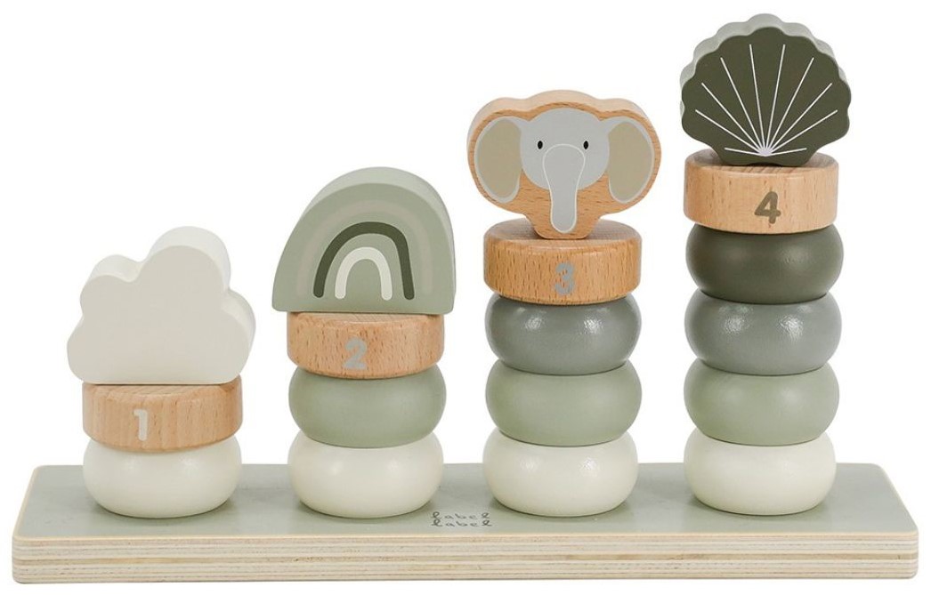 Drvena didaktička igračka izrađene od visokokvalitetnog FSC certificiranog drveta i ukrašena u bojama na bazi vode prilagođenim djeci. Sveukupno se sastoji od 10 drvenih obruča za slaganje u bojama , 4 obruča s brojevima i 4 figure koje pomažu kod slaganja. Pomoću igračke vaše dijete uči se o bojama, brojati i razvrstavati.