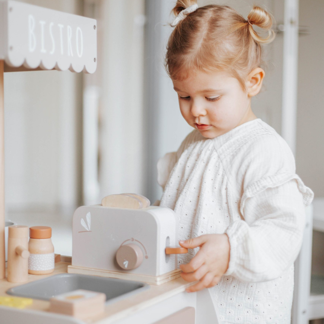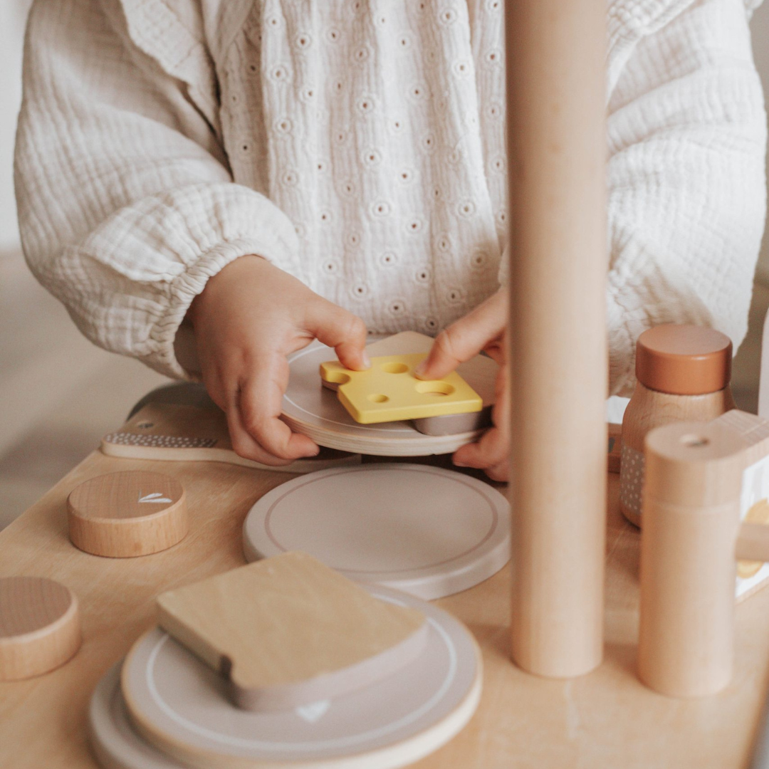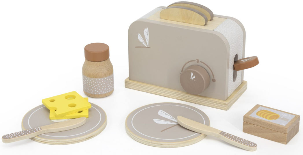 S ovim prekrasnim tosterom vaše će dijete napraviti najbolji tost ikada i poslužiti ga s dodacima po vašem izboru. Toster je izrađen od visokokvalitetnog FSC-certificiranog drveta i dolazi u prekrasnim bojama na bazi vode primjerenim za djecu. Uz toaster u komplet su uključeni odgovarajući tanjuri i pribor za jelo, sir, maslac i pekmez/čokolada/...Toster s dodacima idealan je za maštovitu igru djeteta. Potiče maštu i kreativnost. Djeca će se kroz igru naučiti kako komunicirati s drugima i vježbati logično zaključivanje i koordinaciju oko-ruka.