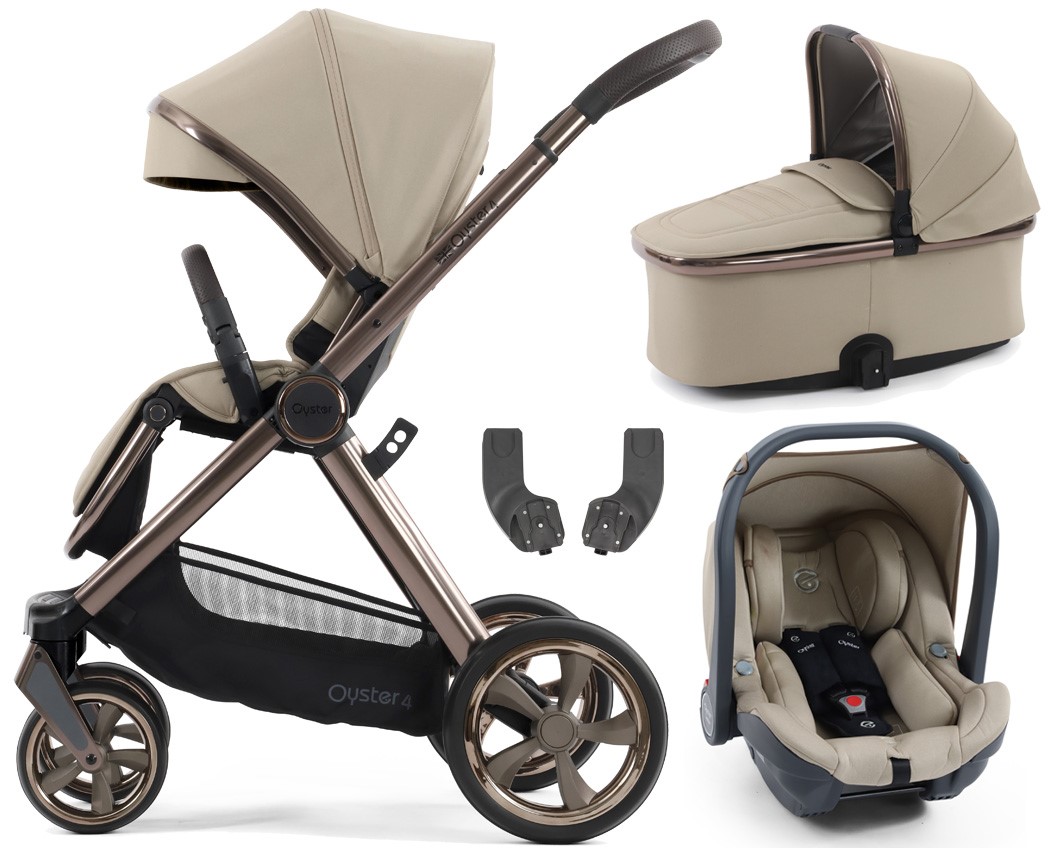 3u1 set Oyster4 kolica uključuje: konstrukciju, sportsko sjedalo, košaru za novorođenče, dvije kišne navlake, adaptere za autosjedalicu i Oyster Capsule autosjedalica.