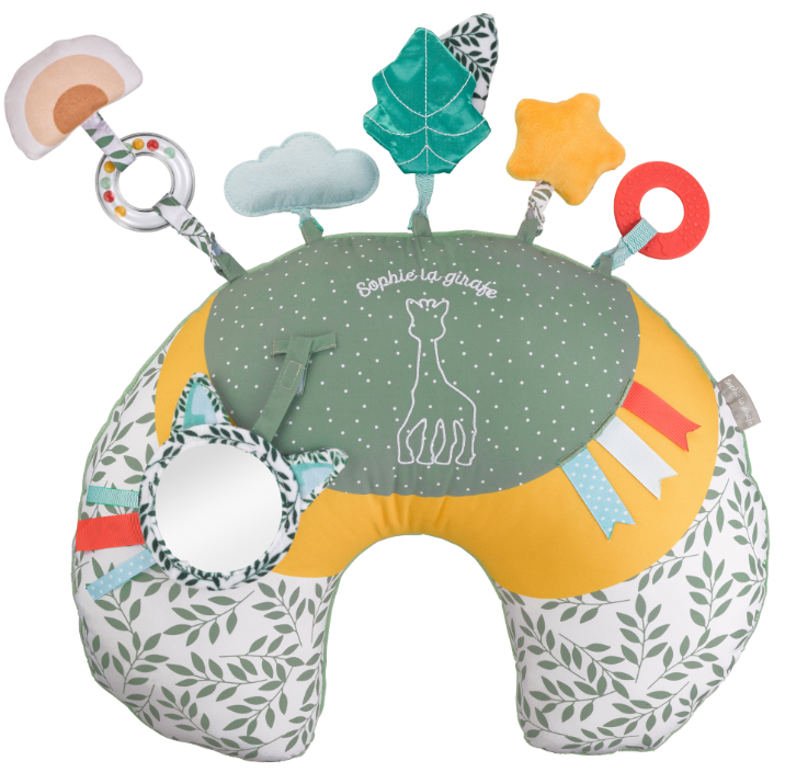Preslatki Sophie jastuk prilagođava se ritmu rasta vašeg djeteta i omogućuje dvije pozicije za razvoj. U ležećem položaju na trbuhu, beba otkriva mnoštvo aktivnosti koje pomažu jačanju mišića vrata i leđa. U sjedećem položaju, zahvaljujući ergonomskom obliku, jastuk se postavlja u bebino krilo, pružajući dodatnu podršku.